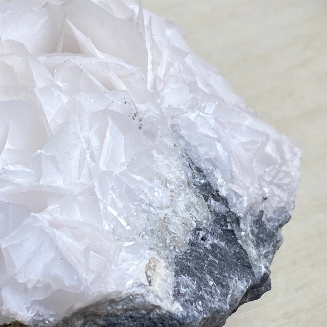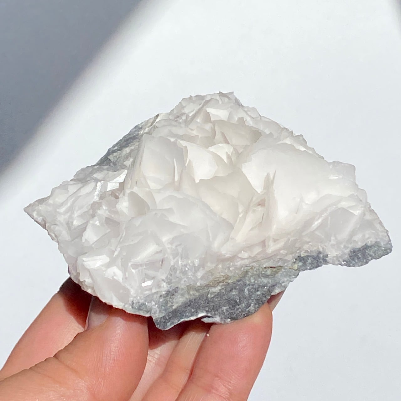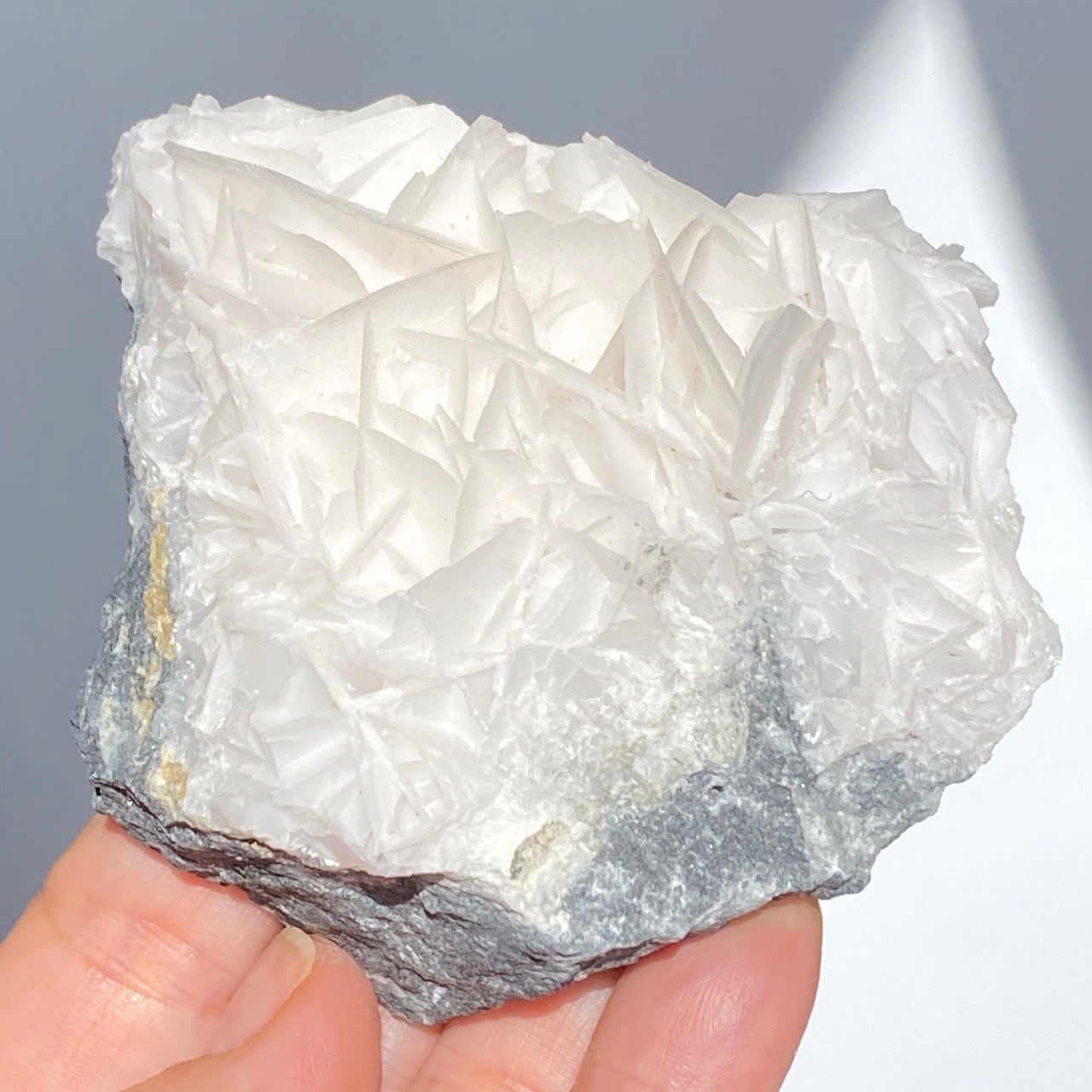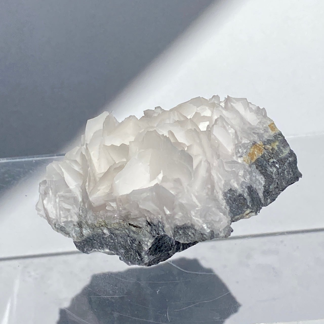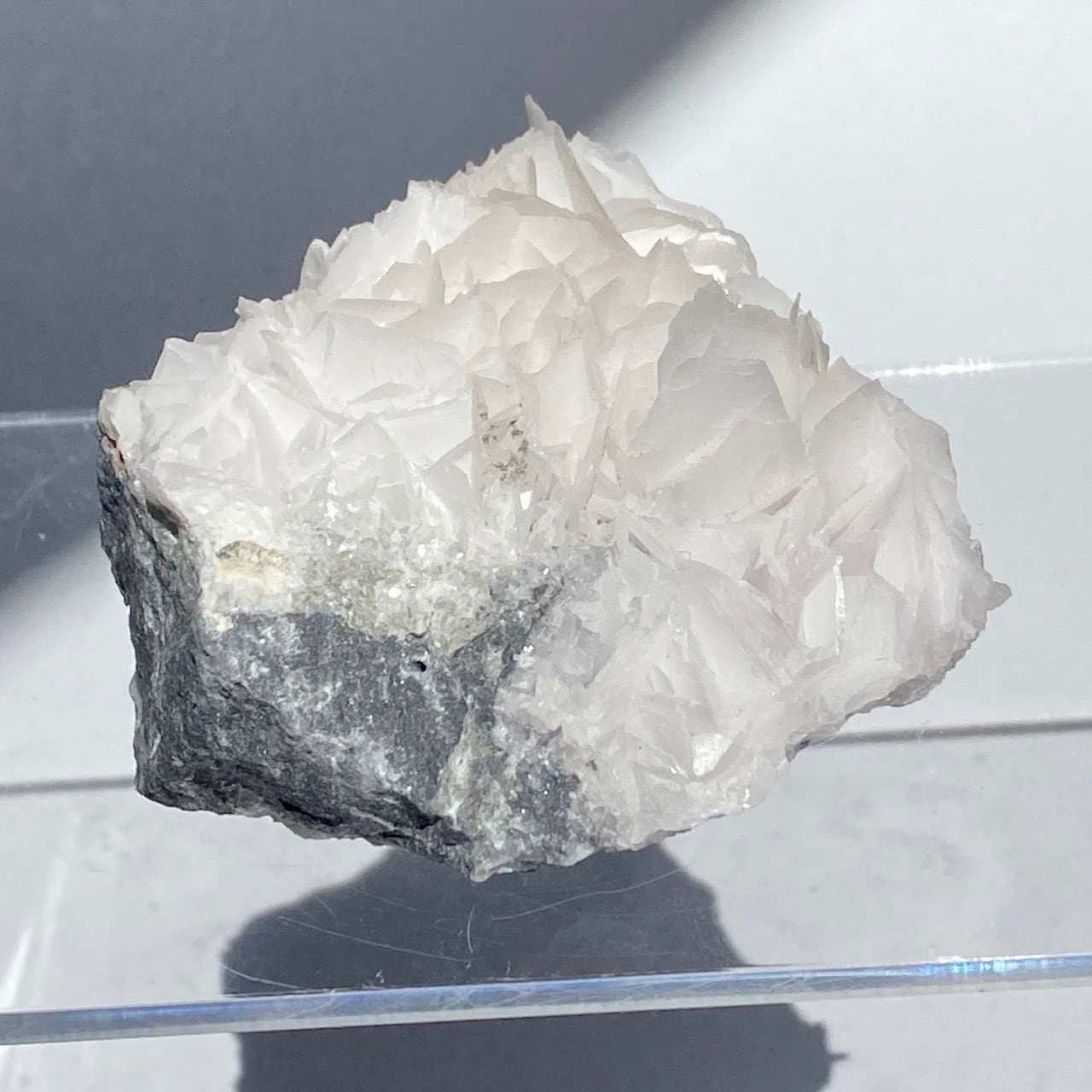 花びらような結晶が交差して形成されており、デザートローズとは異なる純白の美しさがあります。母岩部分とのコントラストも魅力的です。