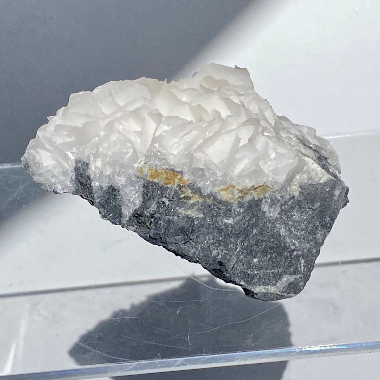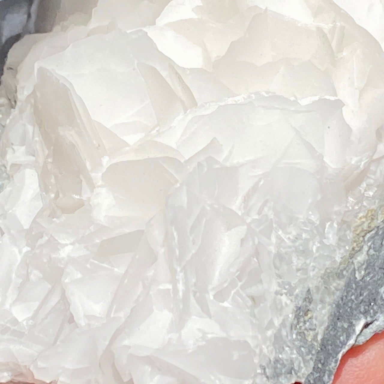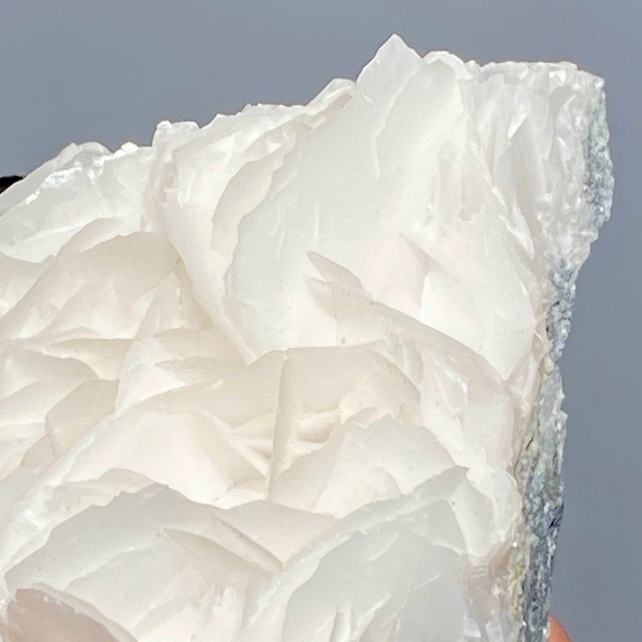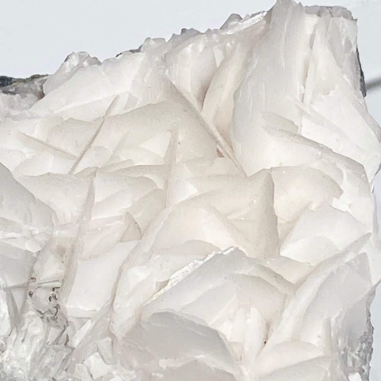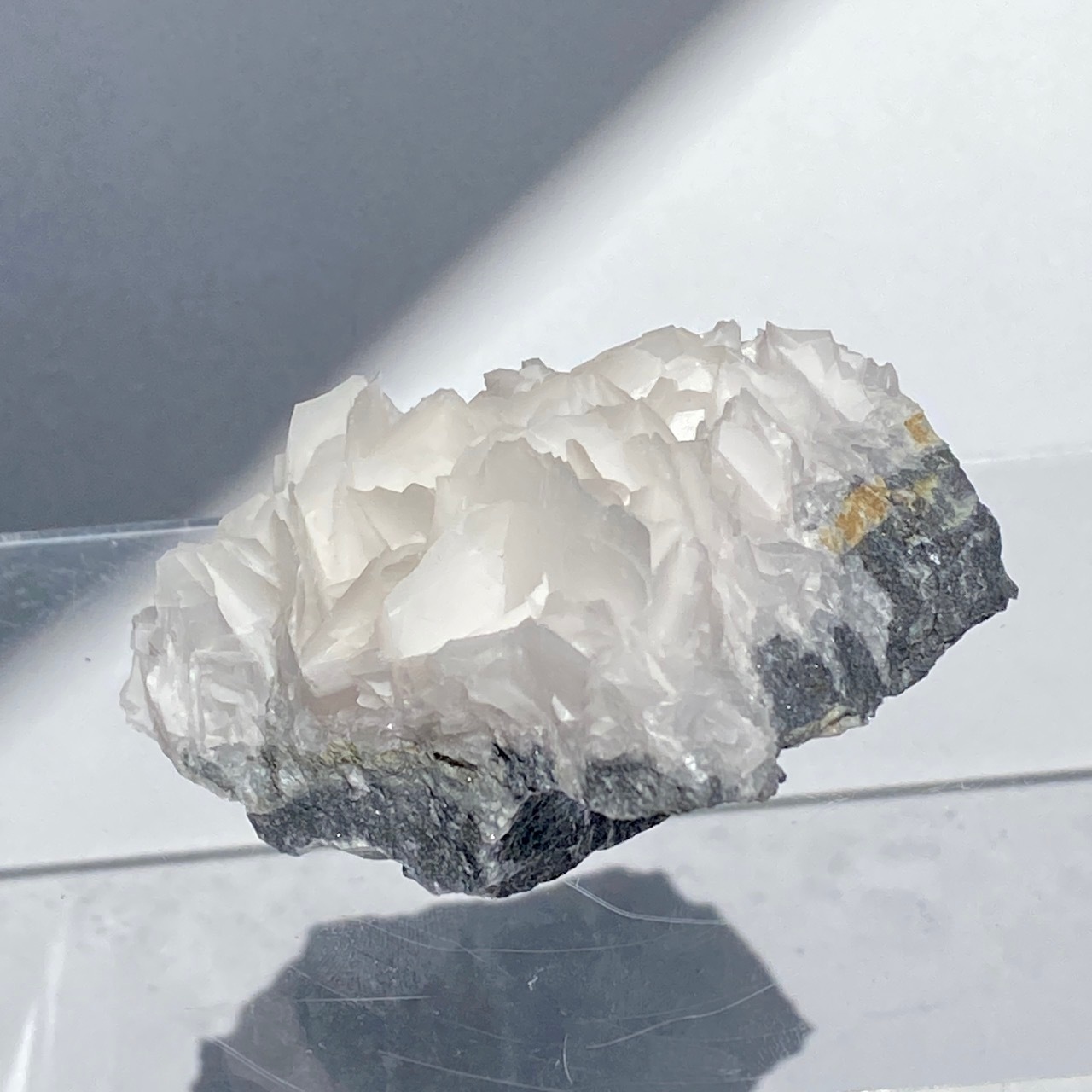 花びらような結晶が交差して形成されており、デザートローズとは異なる純白の美しさがあります。母岩部分とのコントラストも魅力的です。