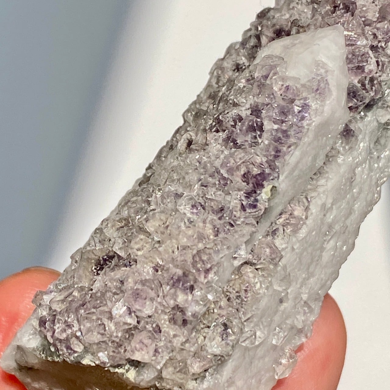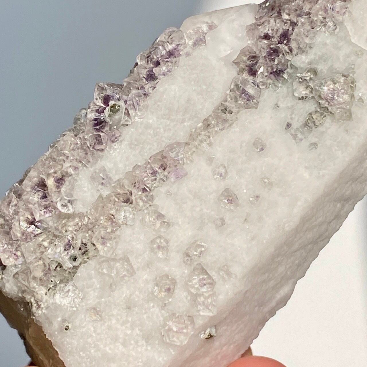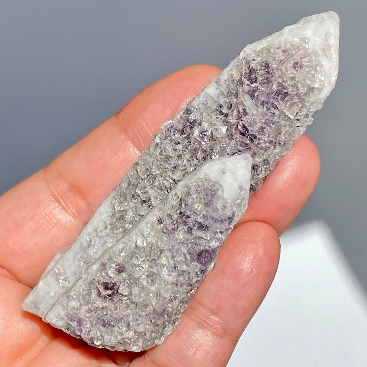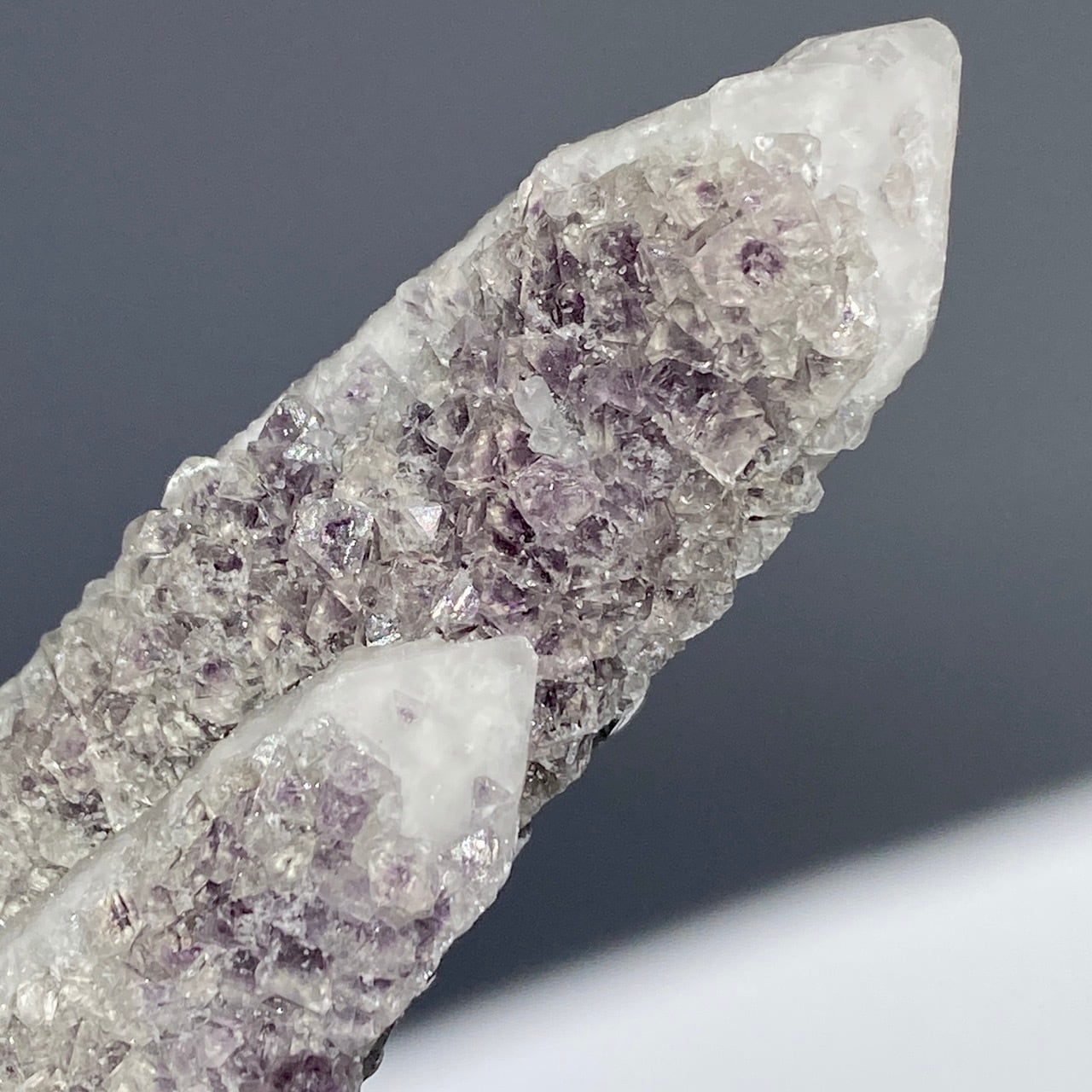 中国の内モンゴル自治区産のクリスタルの素晴らしさとその鉱物共生のバリエーションに感動が止まない店主ですが、今回ご紹介するのが、クォーツ(水晶、若干スモーキー寄り)のポイントにラベンダー〜パープル色のフローライトが共生する子です。