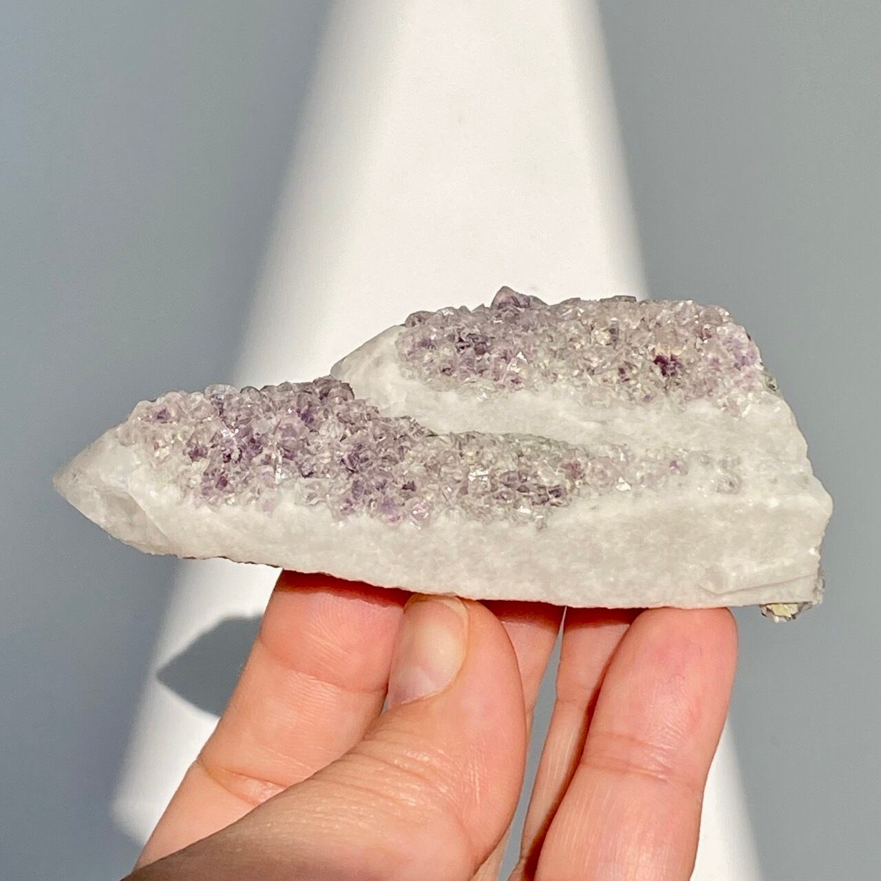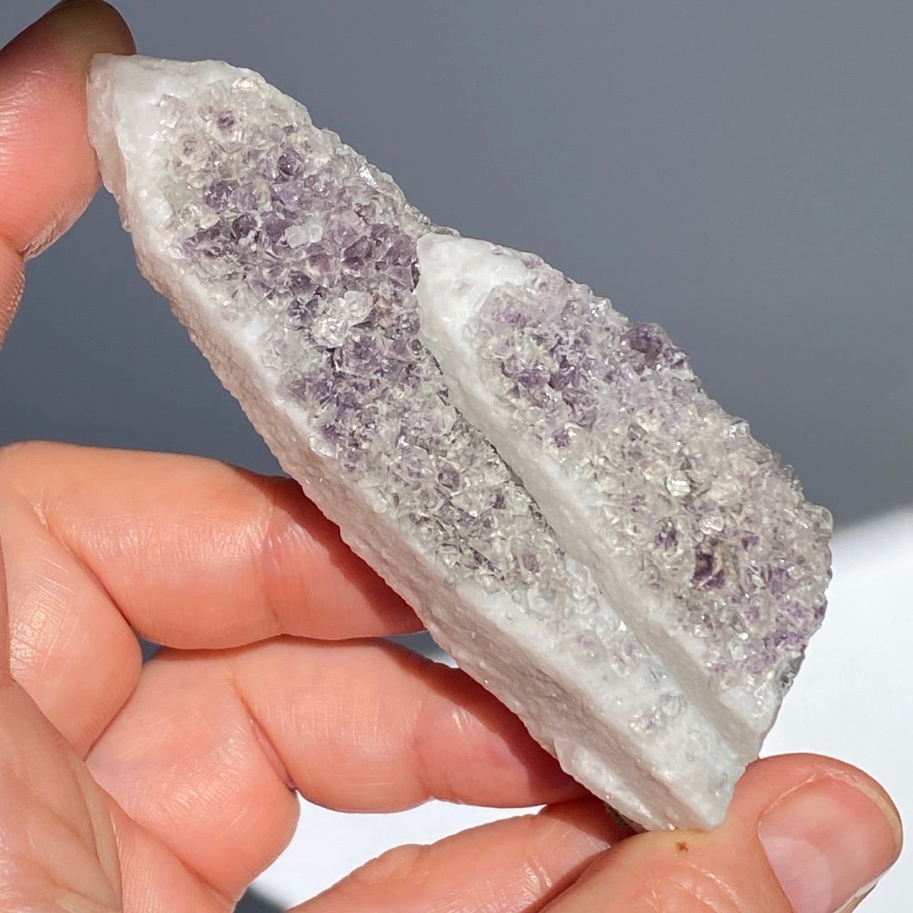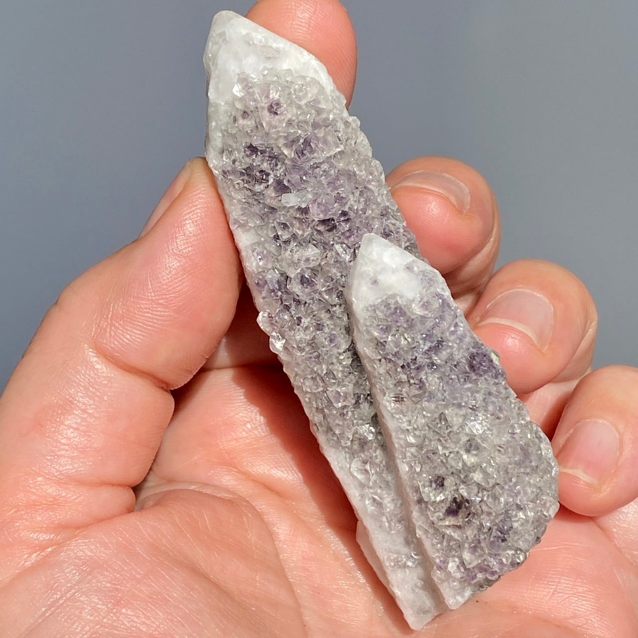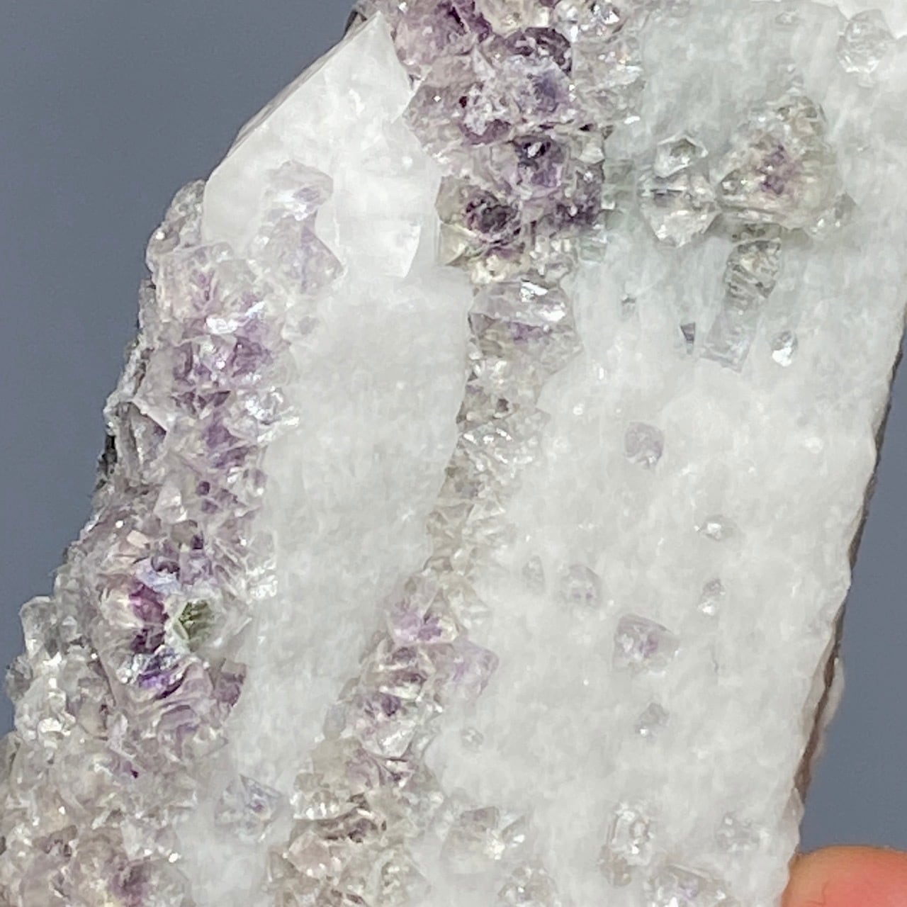 中国の内モンゴル自治区産のクリスタルの素晴らしさとその鉱物共生のバリエーションに感動が止まない店主ですが、今回ご紹介するのが、クォーツ(水晶、若干スモーキー寄り)のポイントにラベンダー〜パープル色のフローライトが共生する子です。