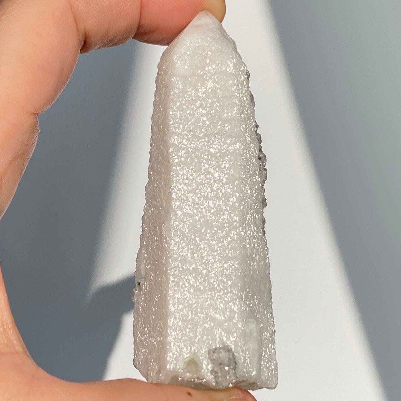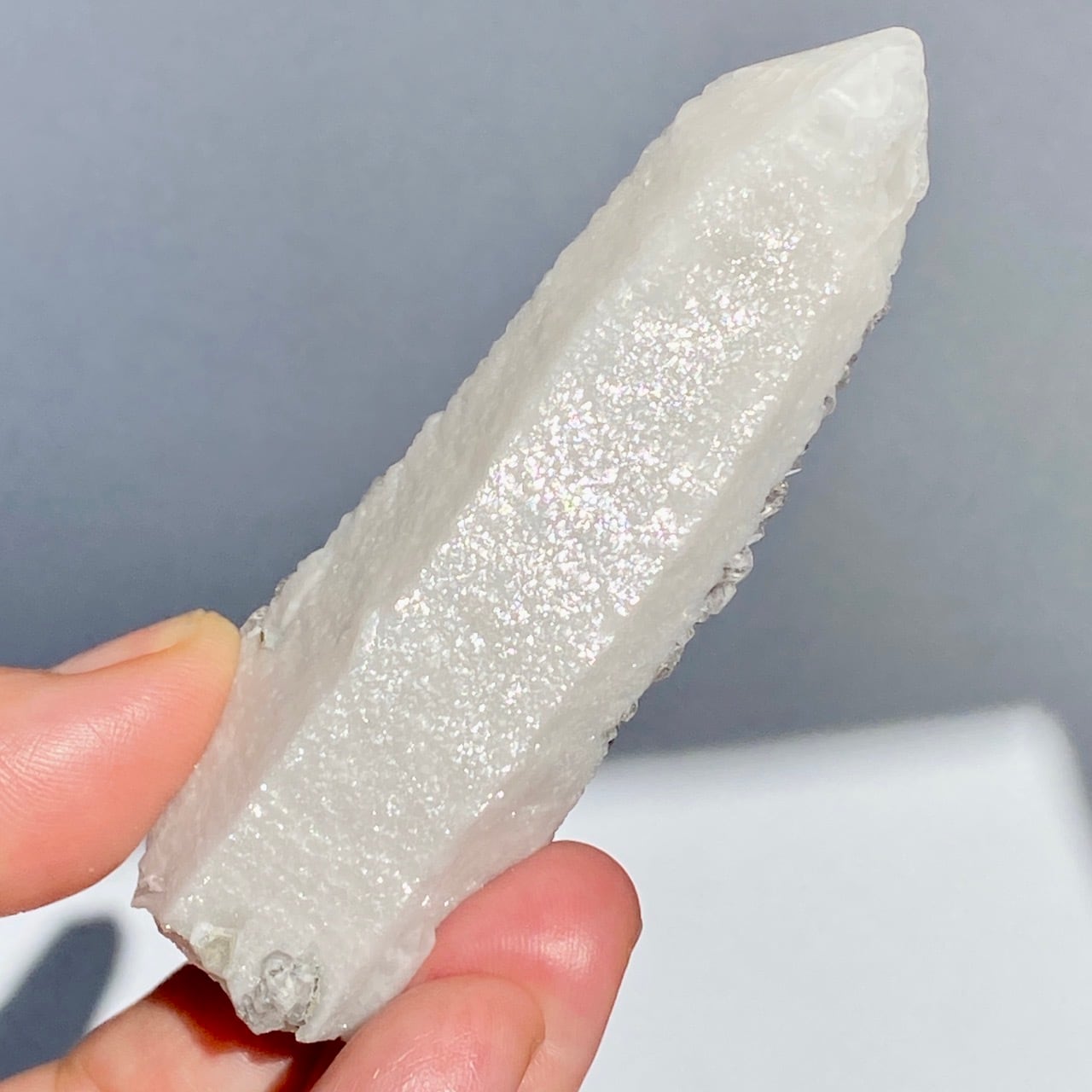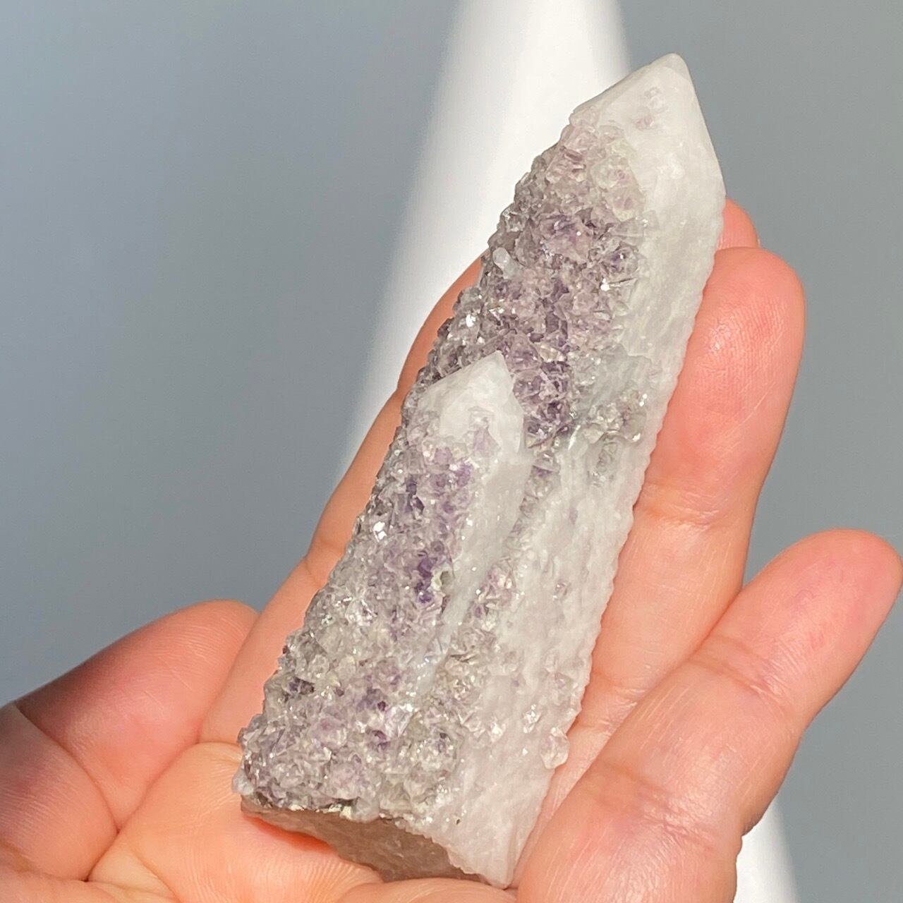 キャンドルクォーツとは水晶の表面に、 長石や石英、カルサイトなどの別鉱物が付着し成長を遂げた特殊な単結晶の一種で、文字通りロウソクのような姿をした水晶のことです。そしてこの白いコーティングの上に更にフローライトが共生している珍しいタイプの子です。