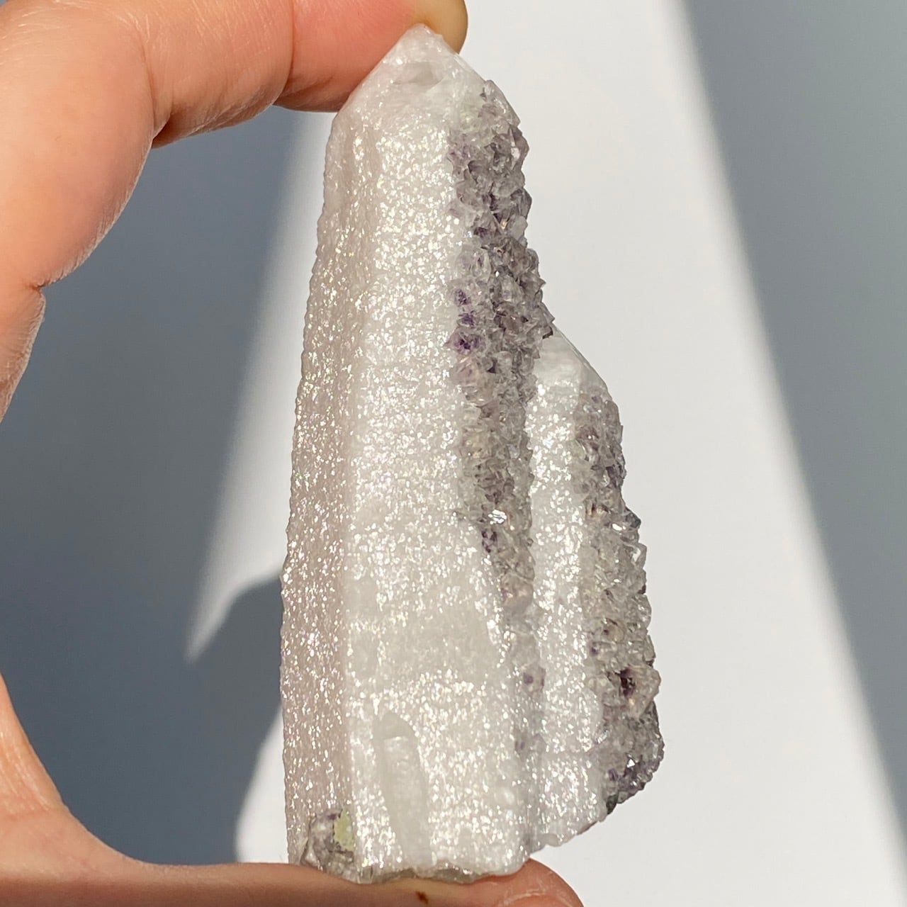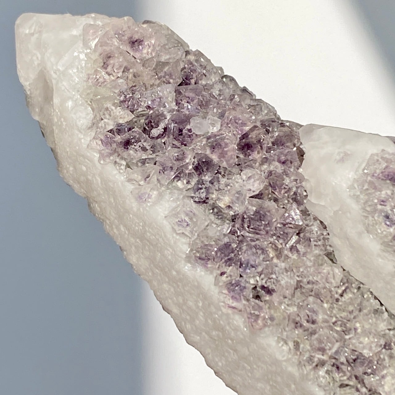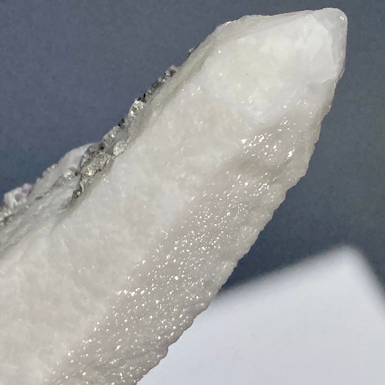 この子は大小のポイントが寄り添った形状からツインさんと名付けたのですが、正面の柱面に所狭しとフローライトが付いています。また、白いコーティング部分が角度を変えることにより美しい光沢を放ちます。そして、最終画像の通り、クォーツとコーティングの断面図をご覧いただけます。