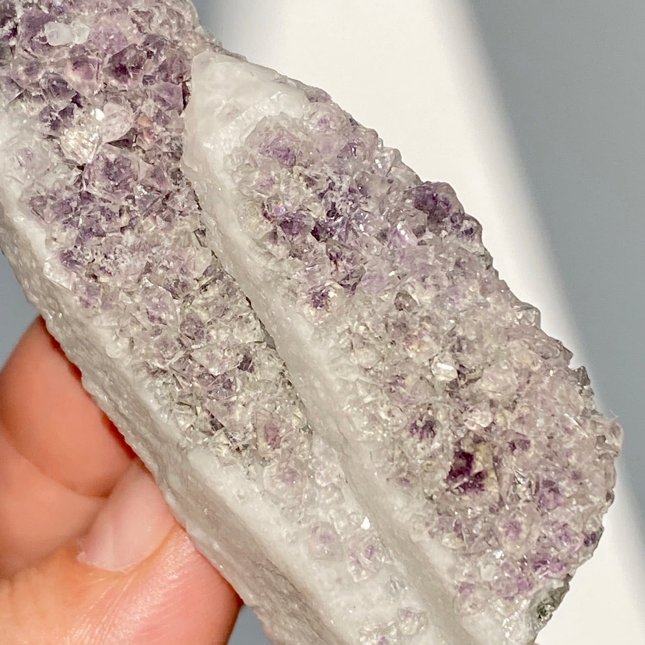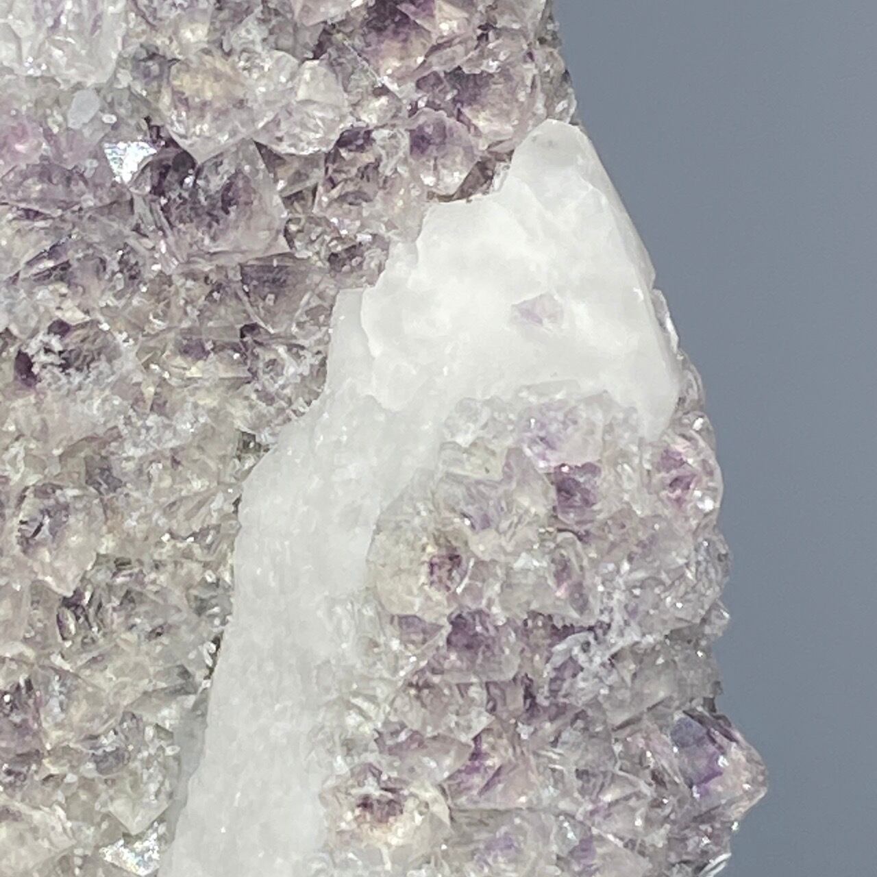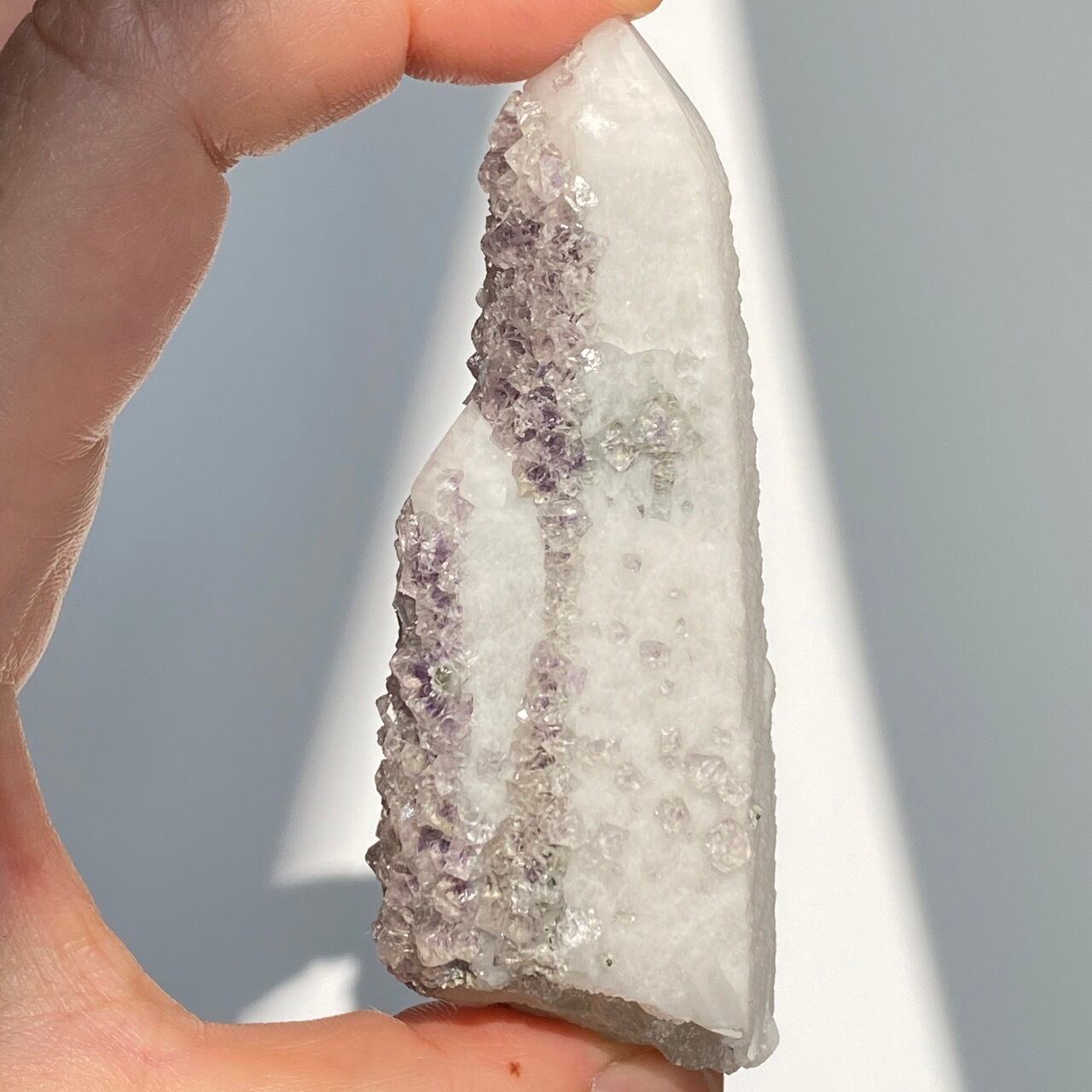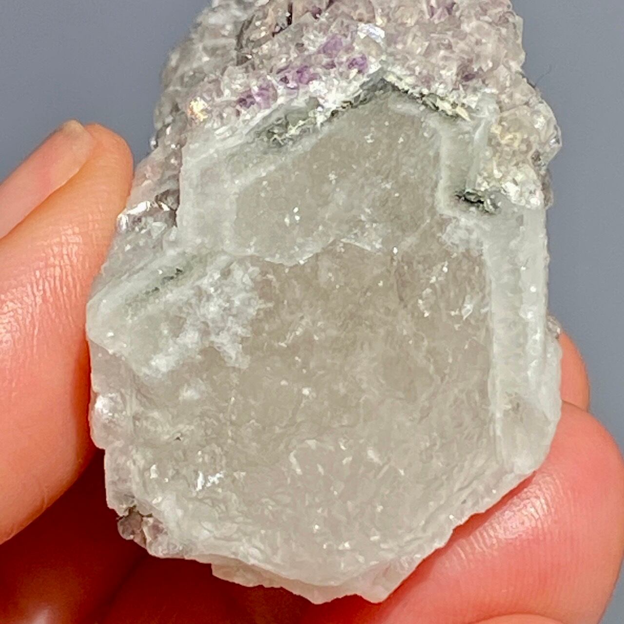 この子は大小のポイントが寄り添った形状からツインさんと名付けたのですが、正面の柱面に所狭しとフローライトが付いています。また、白いコーティング部分が角度を変えることにより美しい光沢を放ちます。そして、最終画像の通り、クォーツとコーティングの断面図をご覧いただけます。