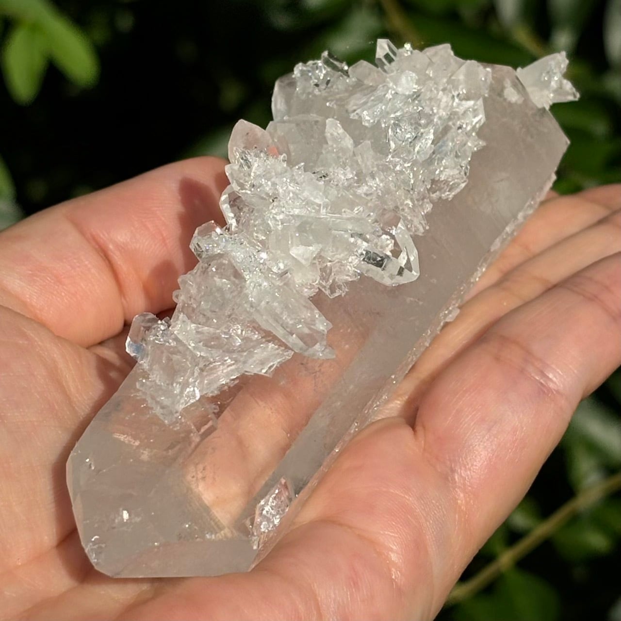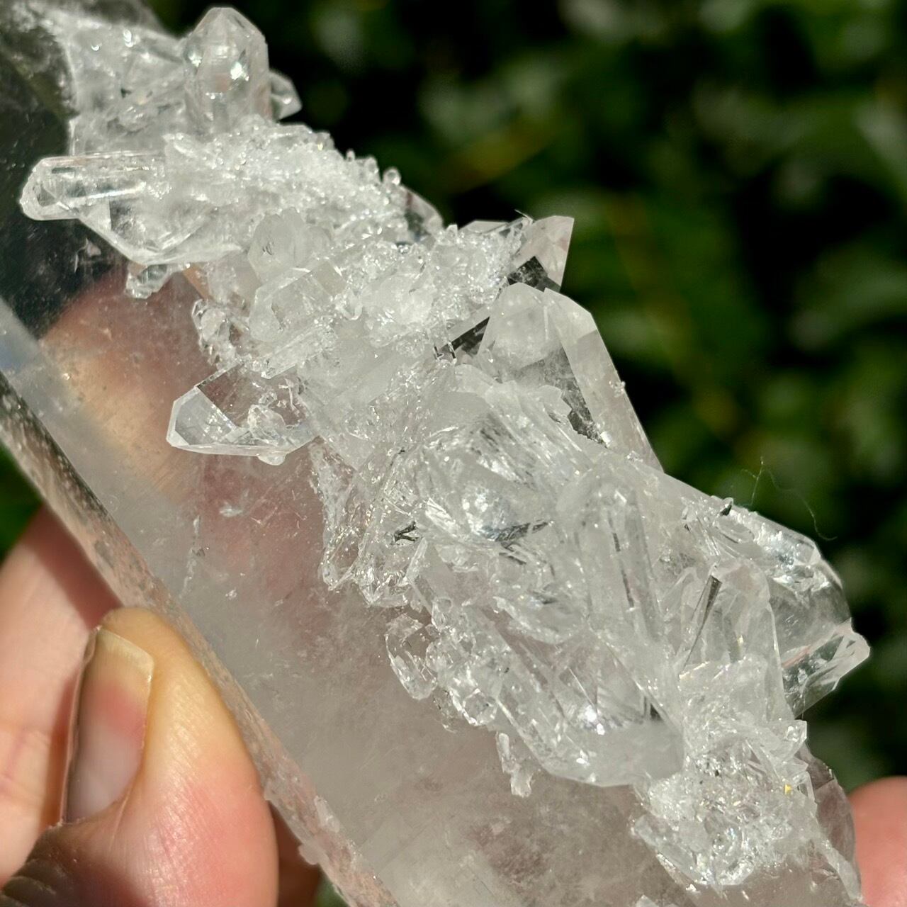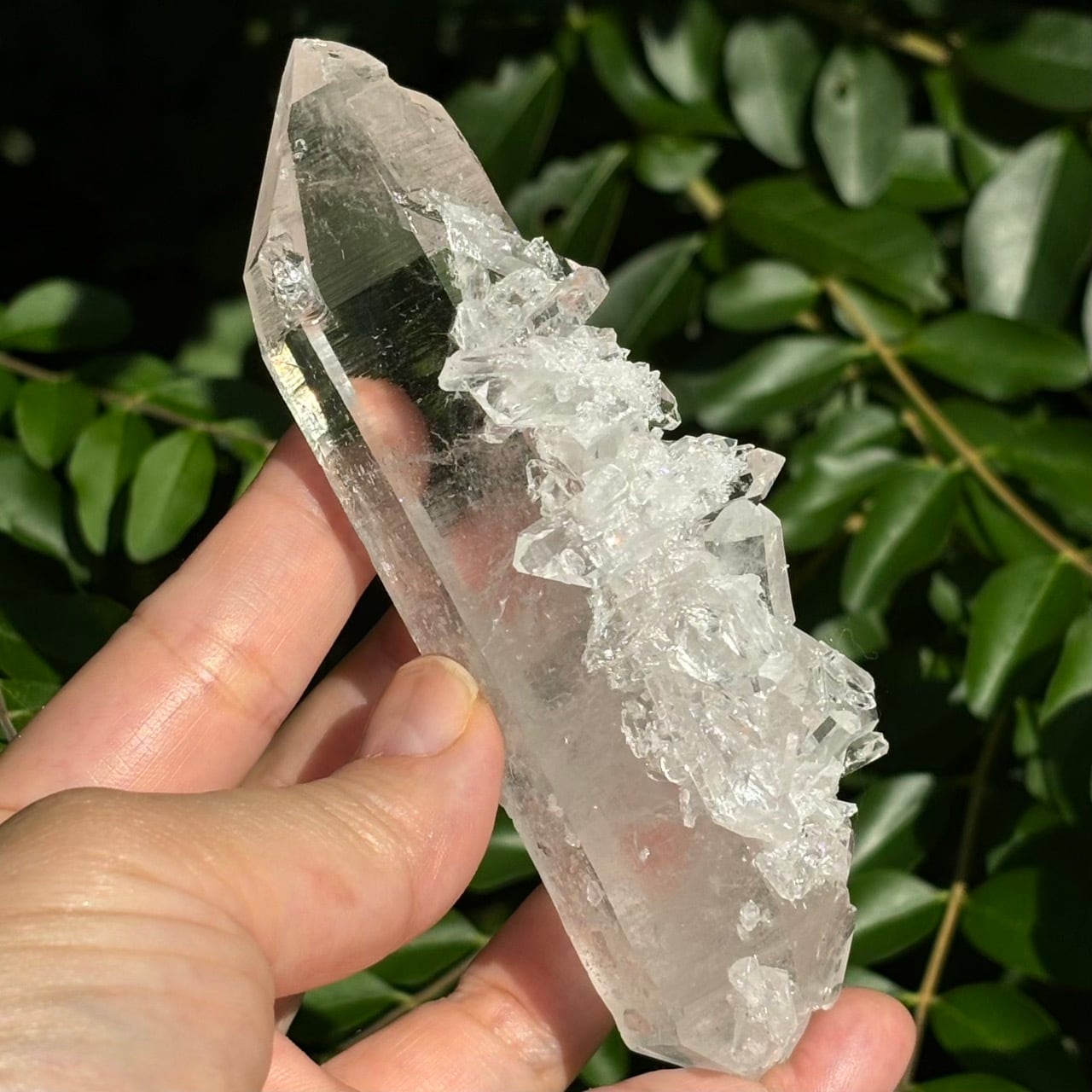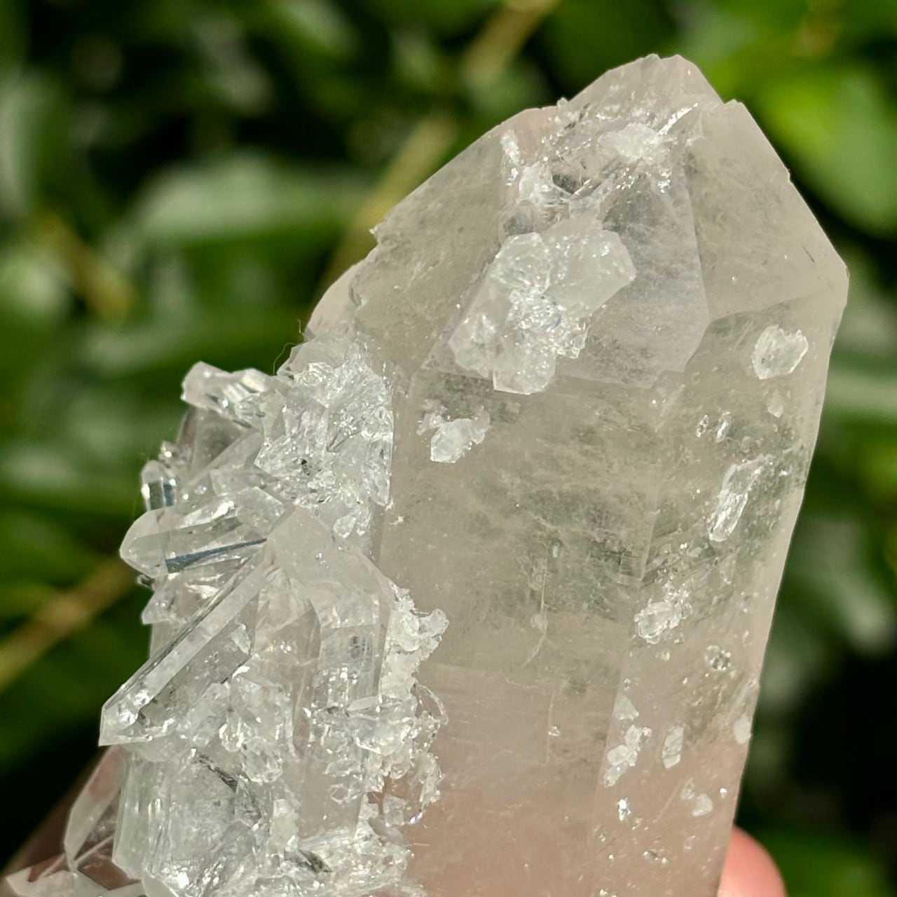 この子は、メインのDT(両剣の)ポイントの一つの柱面を氷のような涼しげな小さいDTポイント達が折り重なる様に覆っている美しい子です。もう一つの柱面にも極小の結晶の破片のようなものが付着しています♡