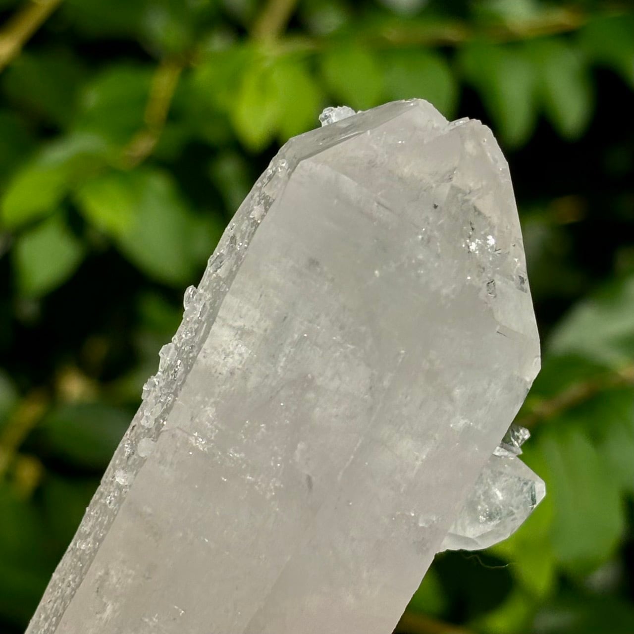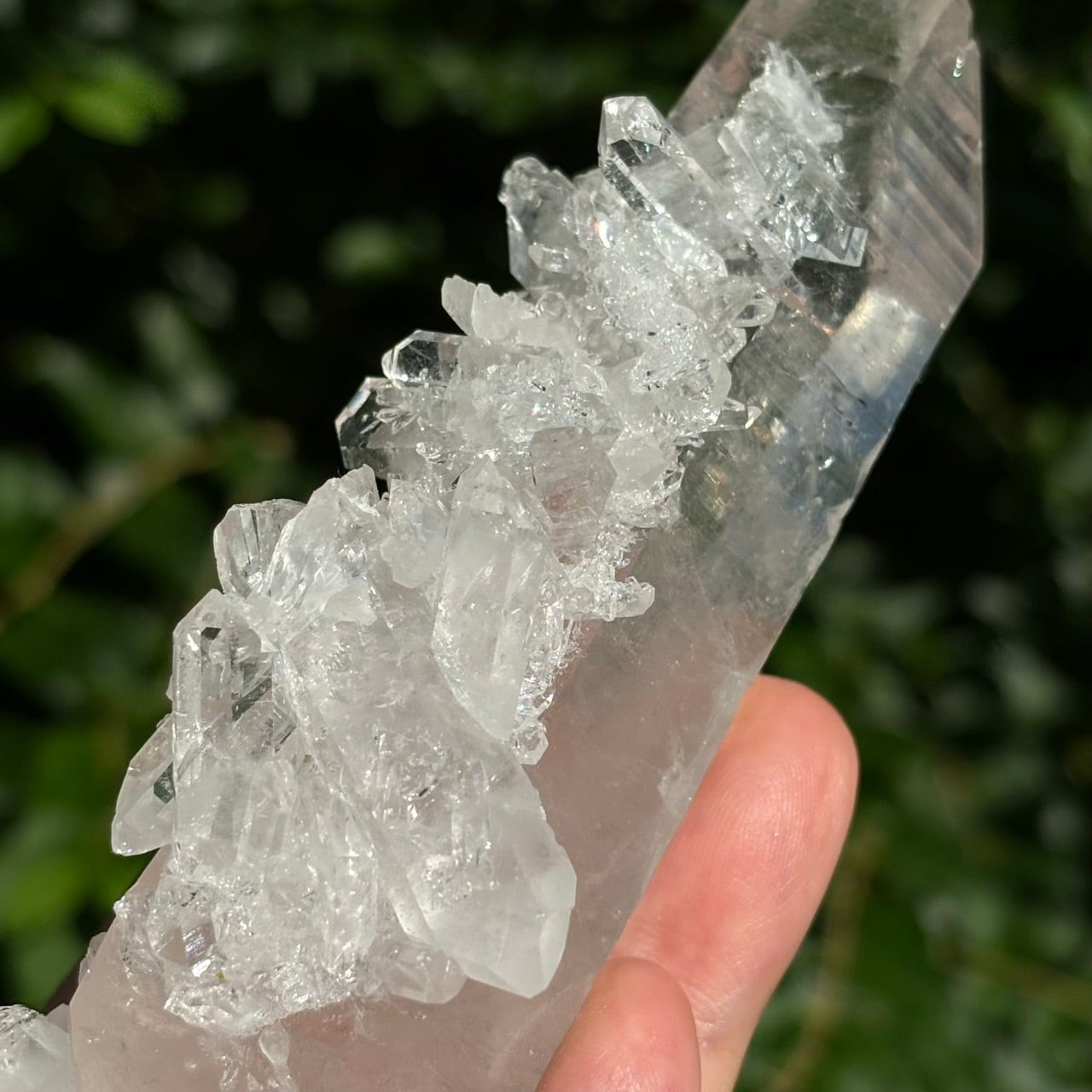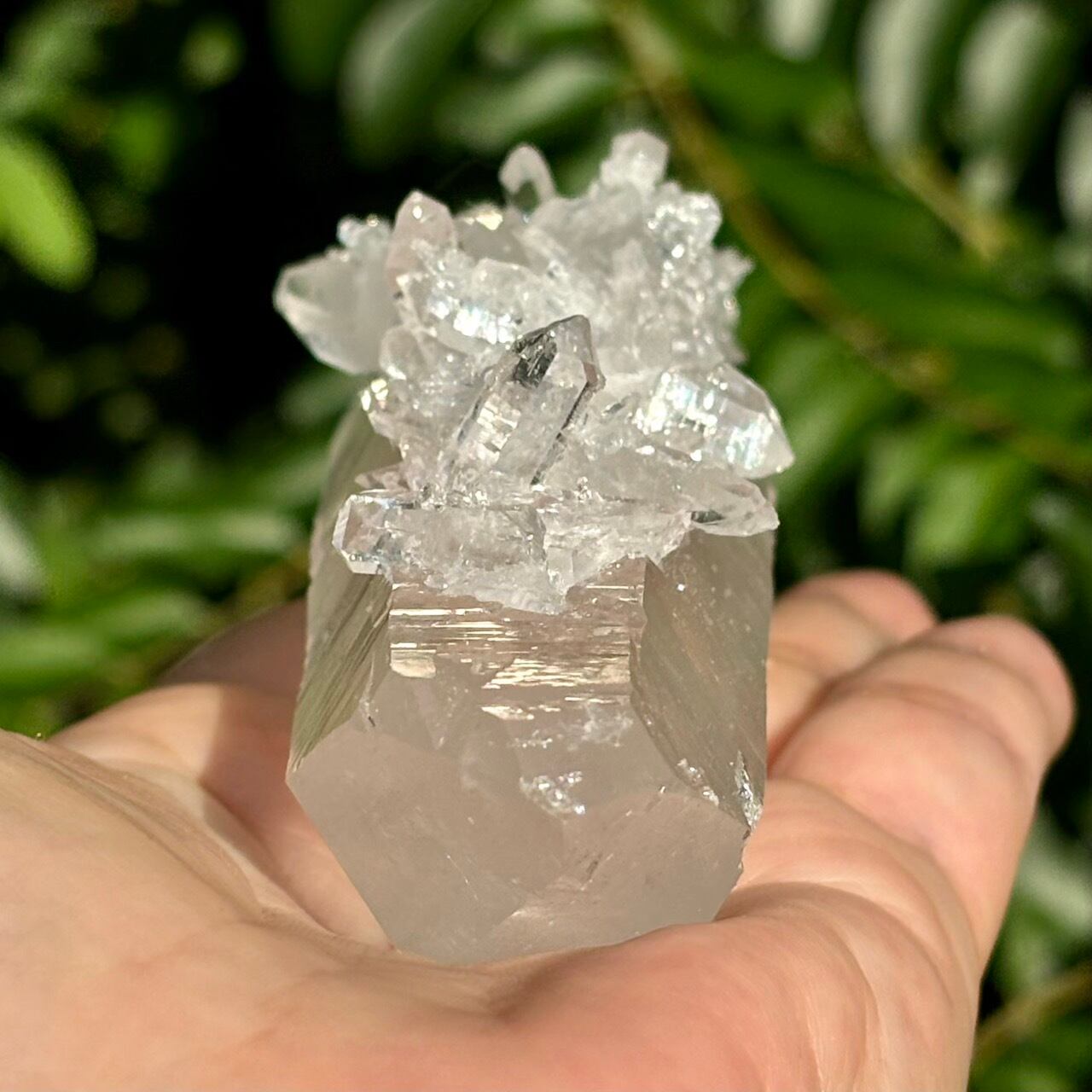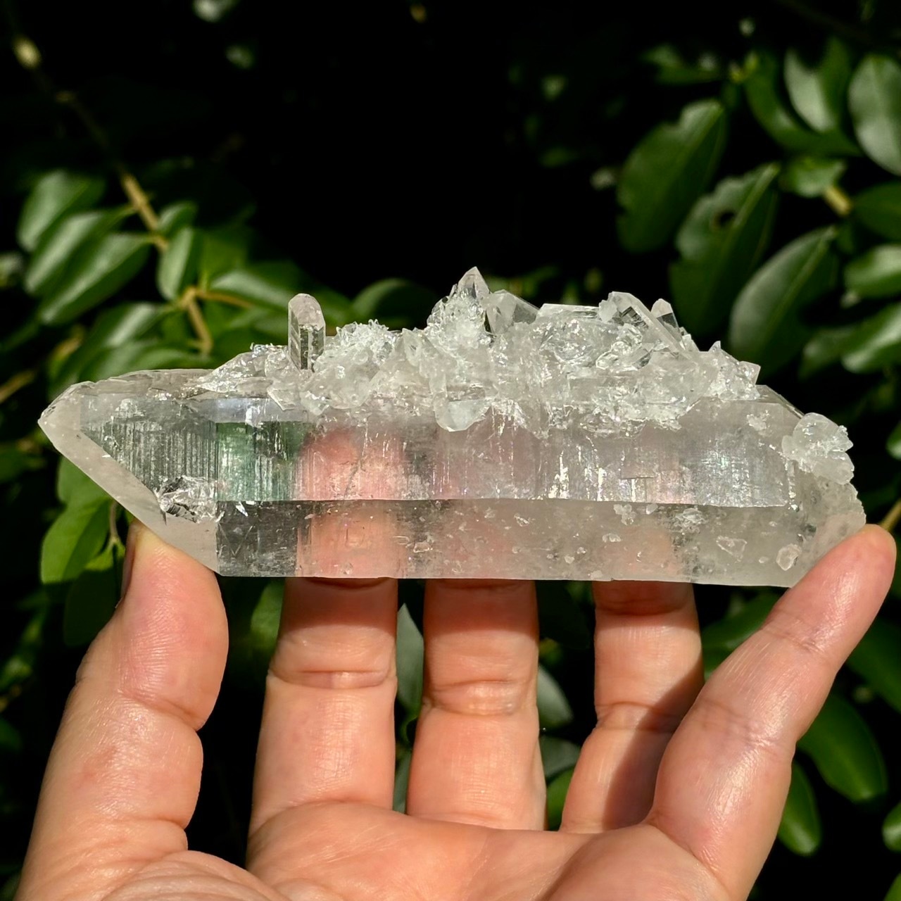 この子は、メインのDT(両剣の)ポイントの一つの柱面を氷のような涼しげな小さいDTポイント達が折り重なる様に覆っている美しい子です。もう一つの柱面にも極小の結晶の破片のようなものが付着しています♡