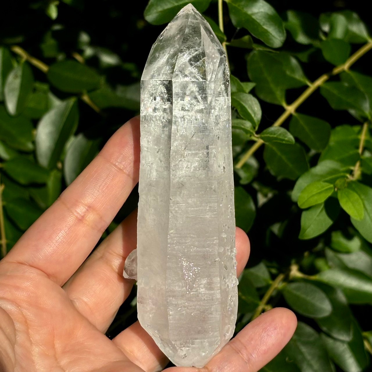 アーカンソー州産水晶の特徴である透明度の高い部分と照りがある清々しい見た目を持ち、表面に繊細な成長線も見られます。