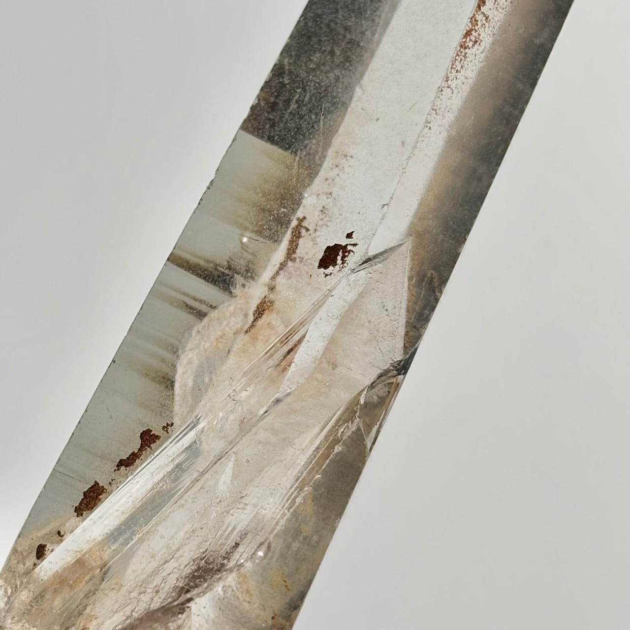 抜群の透明感と美しい照りを放つ幾つかの柱面にレムリアンリッジ(レムリア時代の叡智が刻まれていると言われている条線)が非常に薄らと入ったレーザーワンドで、しかもシンギングクリスタルのため、心地よい音色が響きますのでクリスタルが奏でる聖なる音をお楽しみ下さい♡