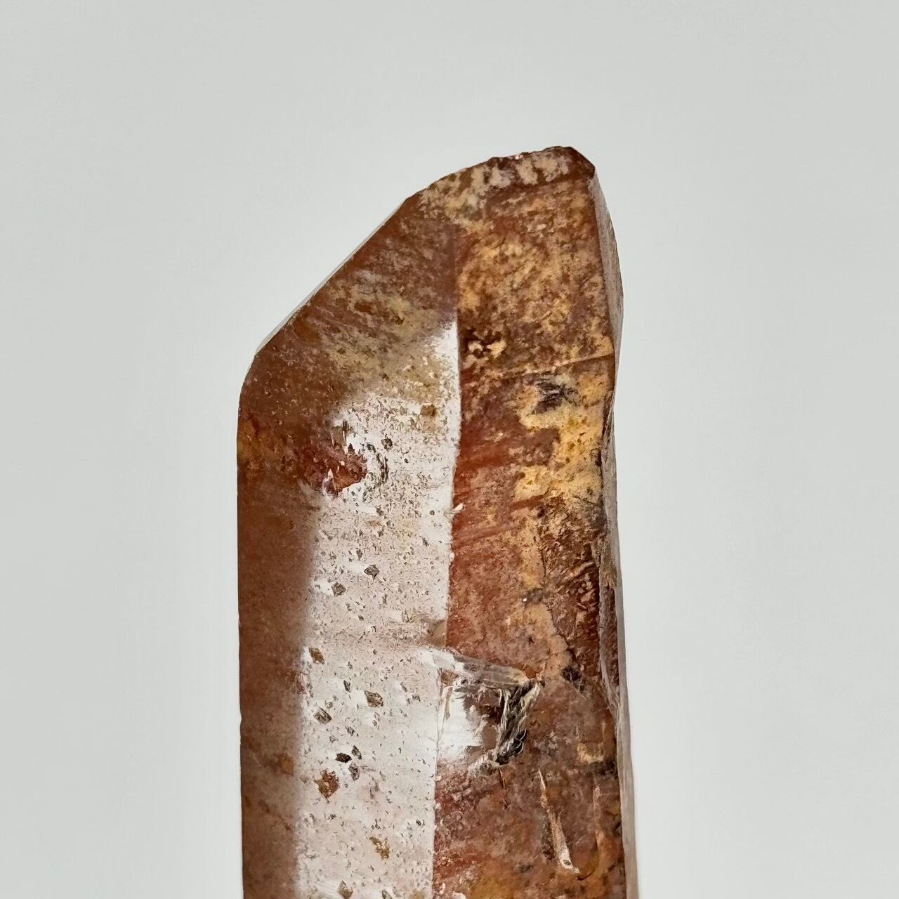 この子はヘマタイトの付着した三つの柱面以外はファセット含めポリッシュ(若しくはセミポリッシュ)された個体で、透明度の高い水晶面からは暖かみのあるスモーキーなヘマタイト面のオレンジ色と模様が楽しめ、一番幅の広い柱面に薄らとレムリアンリッジがふわ〜っとび上がり美しく優しいです。