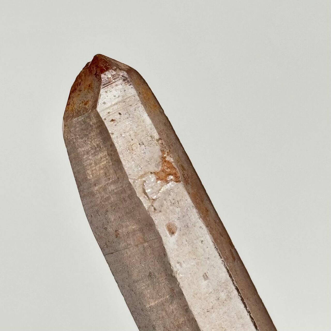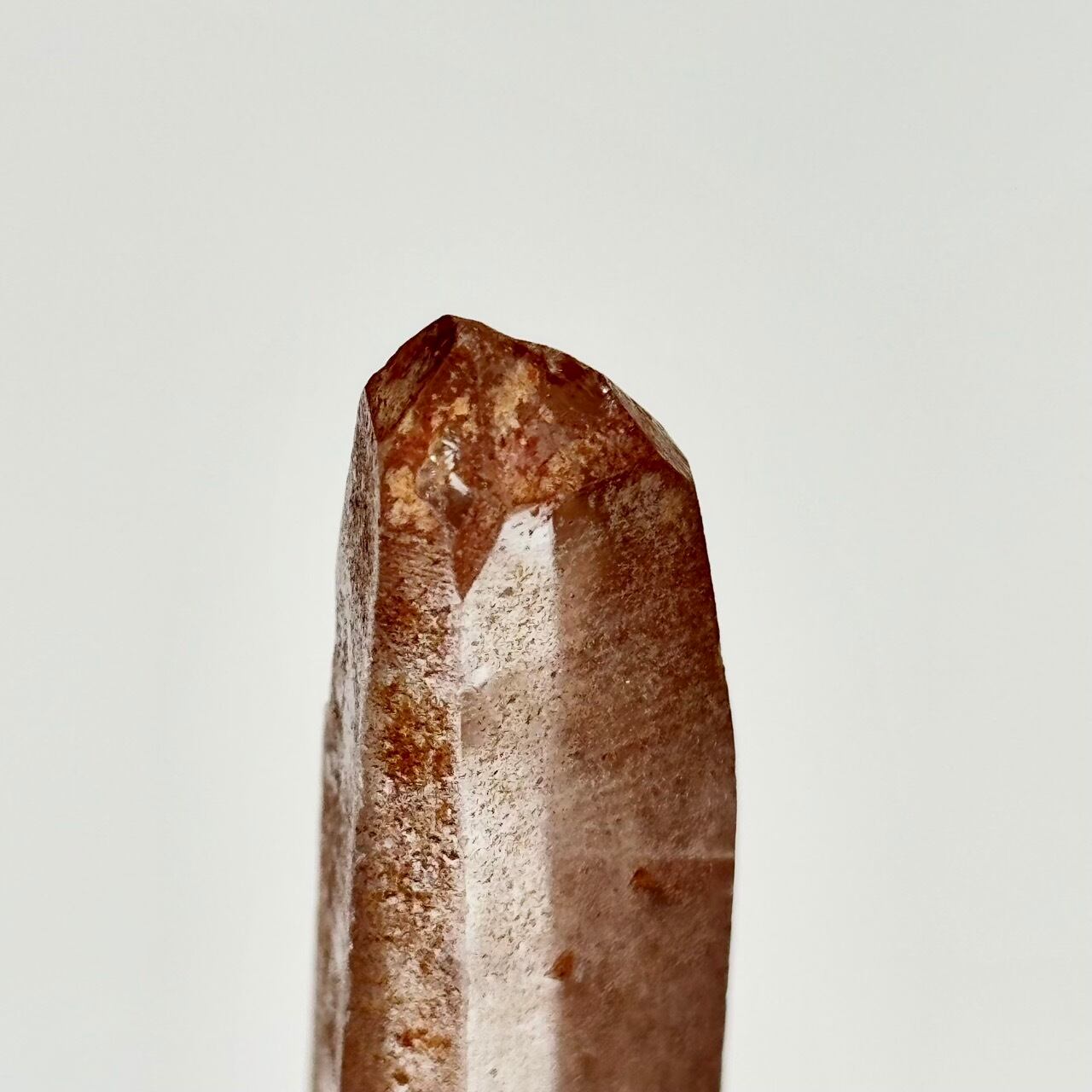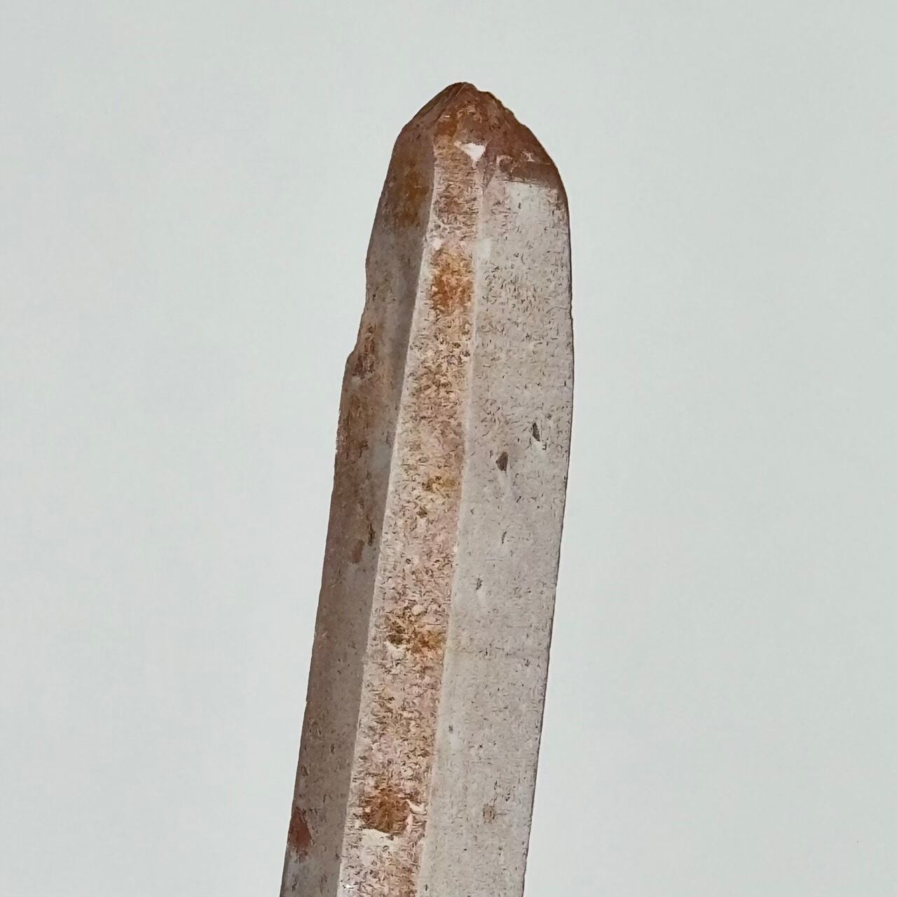 この子はヘマタイトの付着した2の柱面と以外は、セミポリッシュされた個体で、磨かれた透明度の高い水晶面からは薄らと帯びたヘマタイトの面の暖かいみかん色とまだら模様が楽しめ、レムリアンリッジがふわ〜っとび上がる柱面があります。